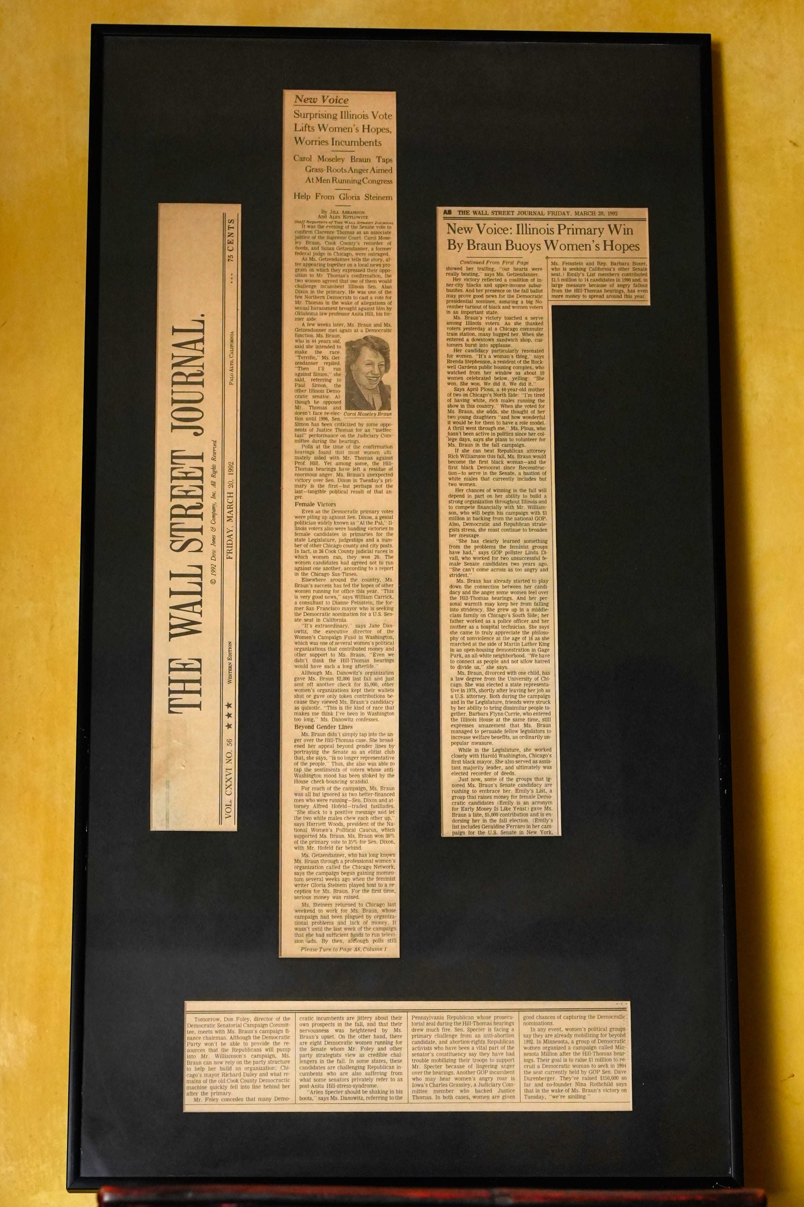 When Carol did confound experts by beating other challengers plus Al Dixon in the primary, it was such an upset that the Wall Street Journal ran the front-page headline you see in the image above. It hangs proudly on my living room wall, and reads: